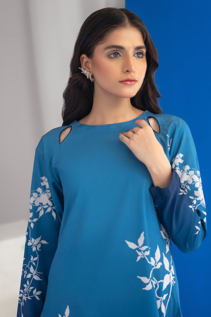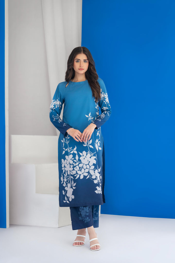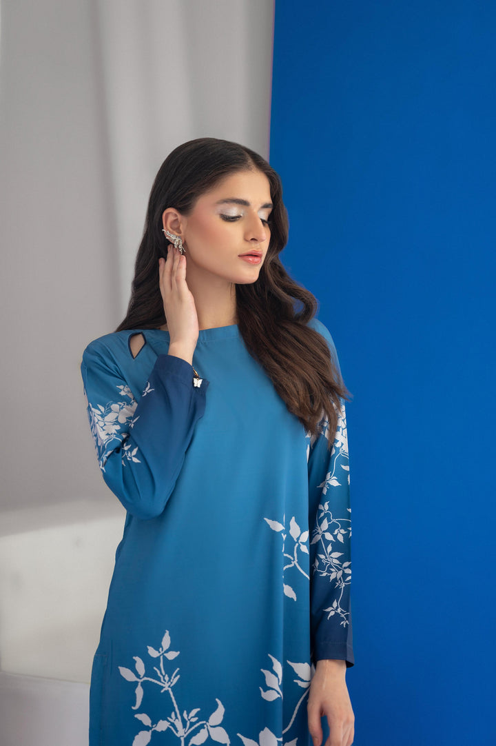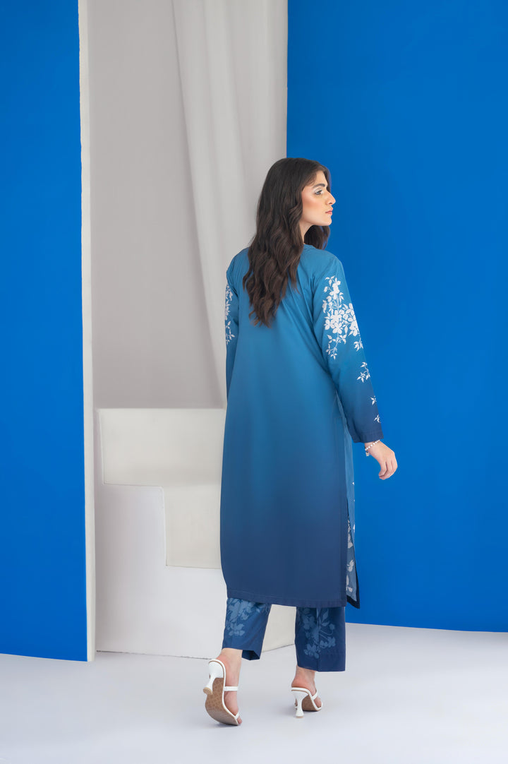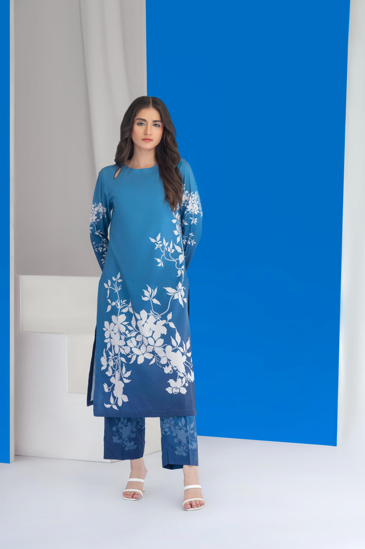 A modern take on classic elegance, this two-piece co-ord set is crafted from soft and breathable poly cambic fabric. The long shirt features a captivating blue ombré effect, transitioning from deep to light tones with a fluid gradient that adds depth and dimension to the silhouette. Adorned with a delicate white floral print.