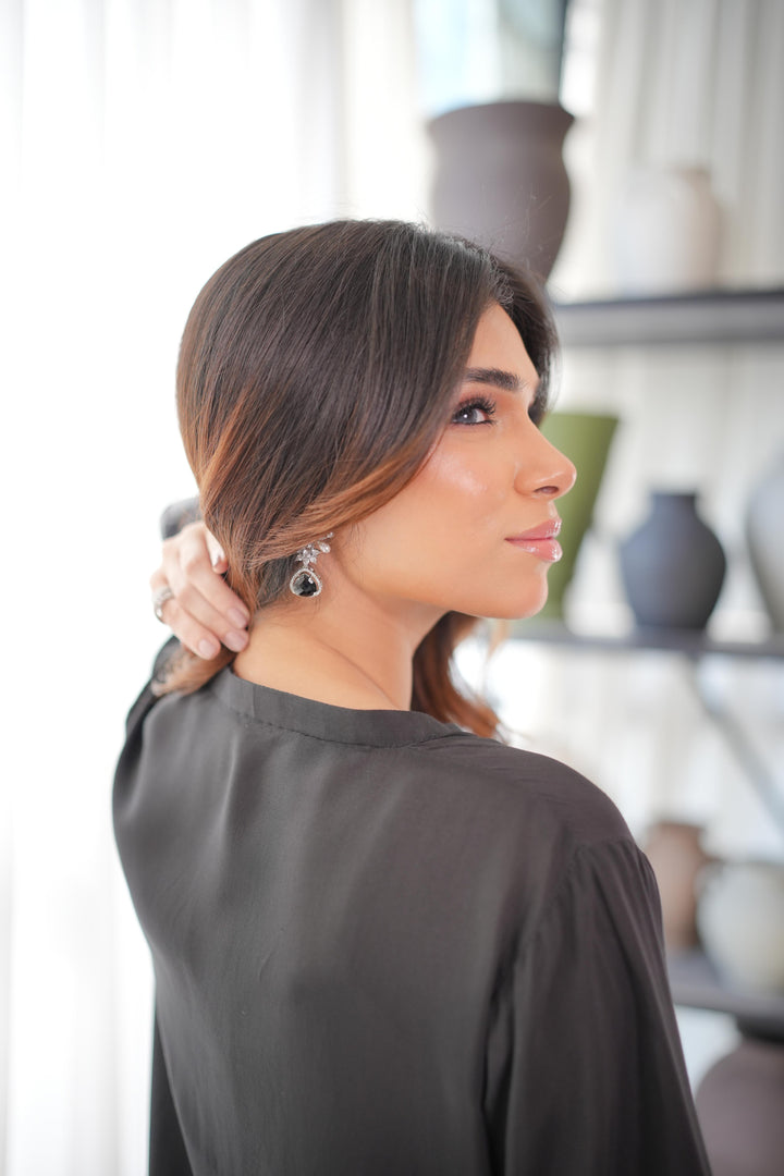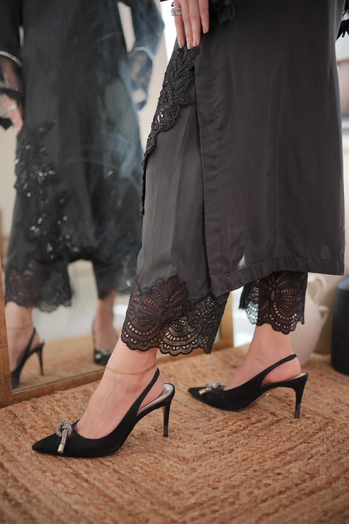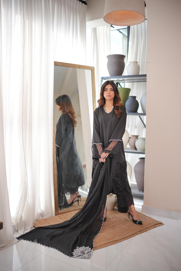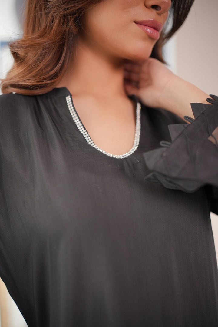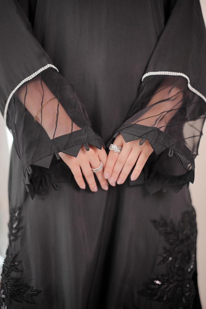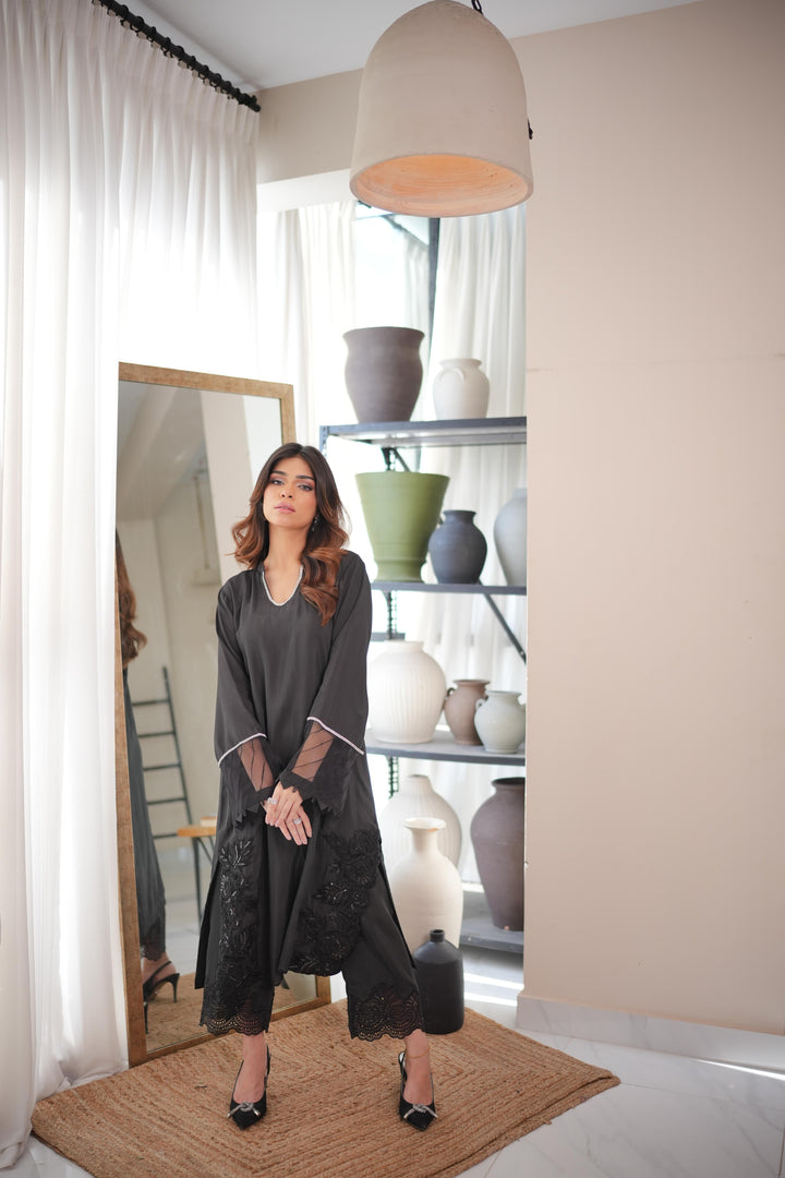 This sophisticated black two-piece ensemble is a perfect blend of elegance and modern charm. The long cotton silk shirt features intricate tonal embroidery along the hemline, adding depth and richness to the look. The delicate V-neckline is accented with fine piping, while the flared sleeves with sheer organza paneling and ruffled edges add a graceful, contemporary touch.