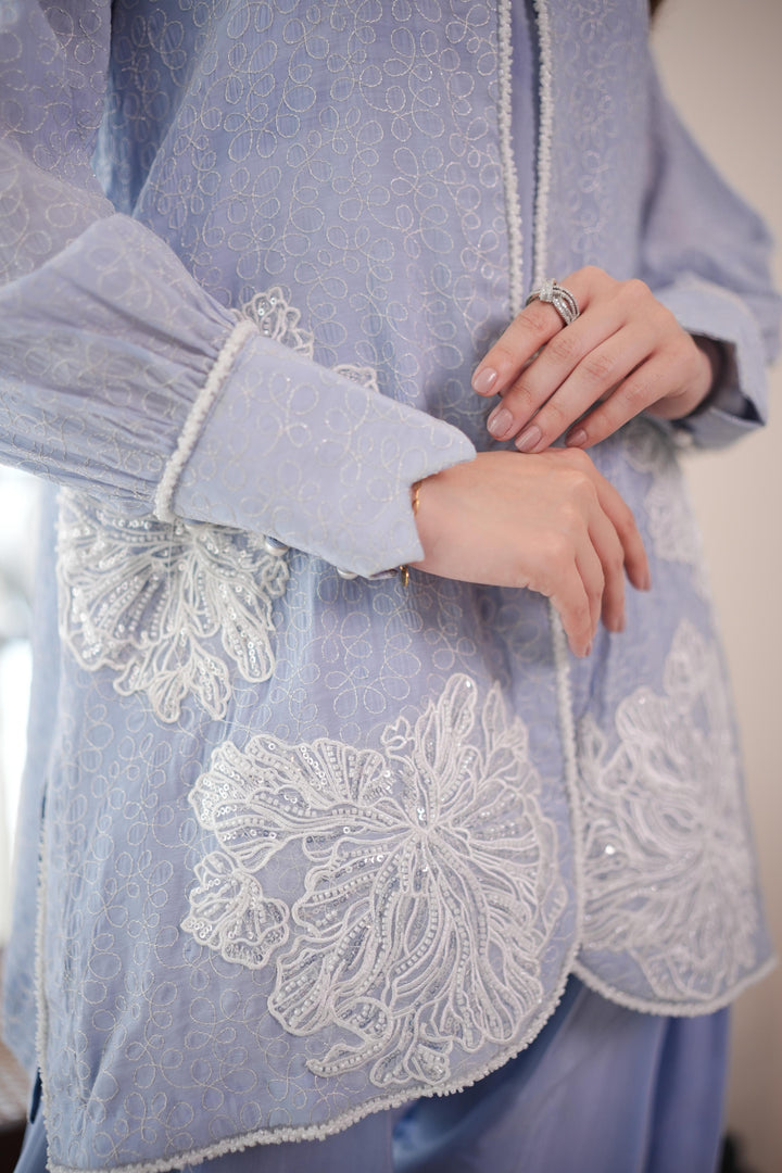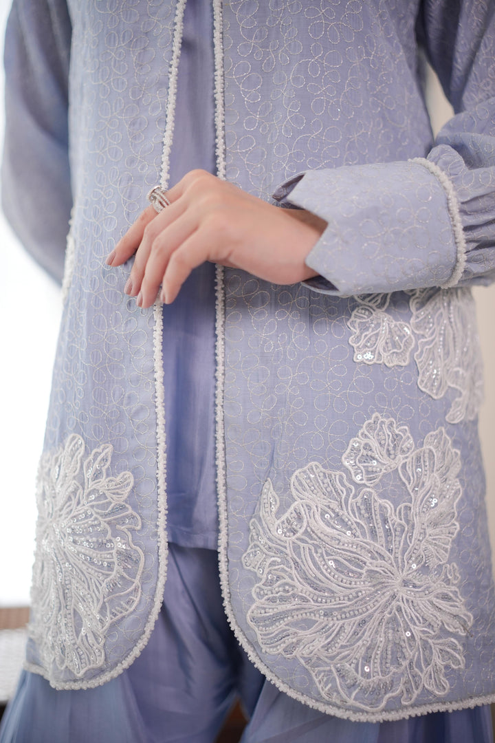This refined and contemporary three-piece ensemble is designed to blend elegance with comfort. The self-textured short cotton shirt features delicate embroidery along the hemline, adding a touch of sophistication. The round neckline with a minimal buttoned placket enhances its understated charm, while the cuffed sleeves add a structured yet graceful look.
